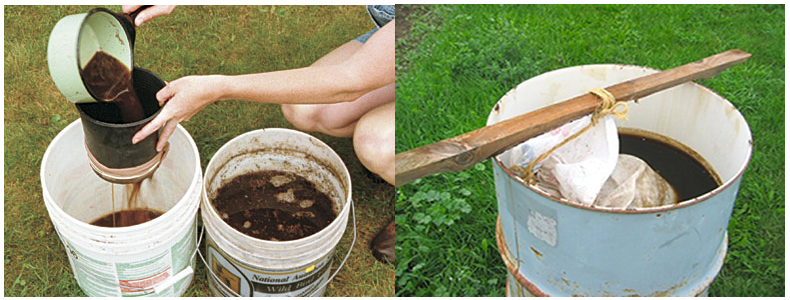 Deja remojar compost HOJA VERDE en agua fría de lluvia, limpia y sin cloro, durante dos o tres días. A modo de medida pon un balde de 10 litros de compost en una tarrina de 50 litros de agua (es decir proporción 1/5). Déjalos reposar durante 3 días. Pasado este tiempo, cuela con una tela limpia de modo que puedas filtrar los sólidos y el agua resultante será el té de compost.